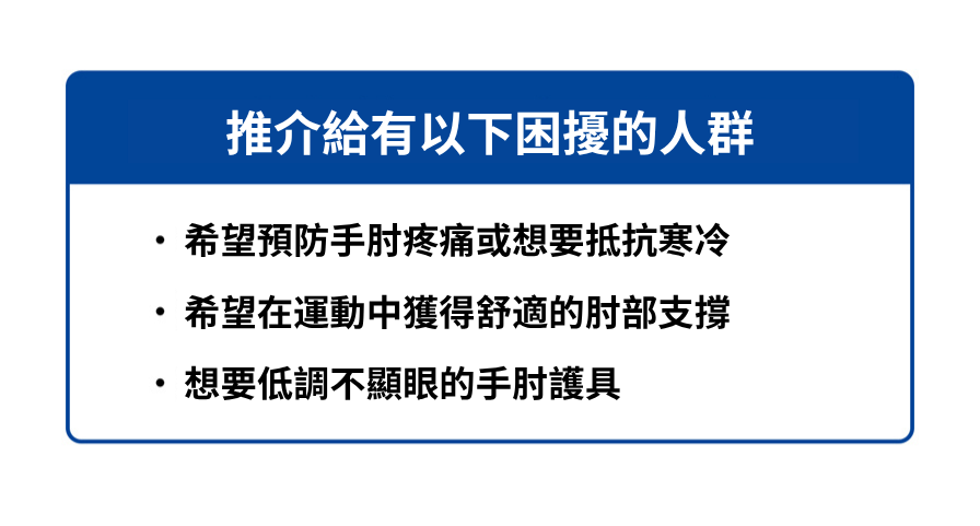 · 對於關節不適或有預防需求的人進行日常護理,适合想要預防手肘疼痛或抵抗寒冷的人士。