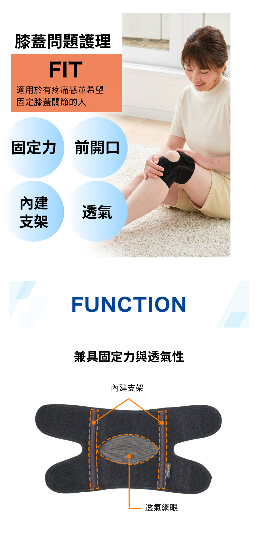 · 日常膝蓋問題護理:適用於有疼痛感並希望固定膝蓋關節的人,或希望運動過程中穩定膝關節避免受傷,兼具固定力與透氣性。