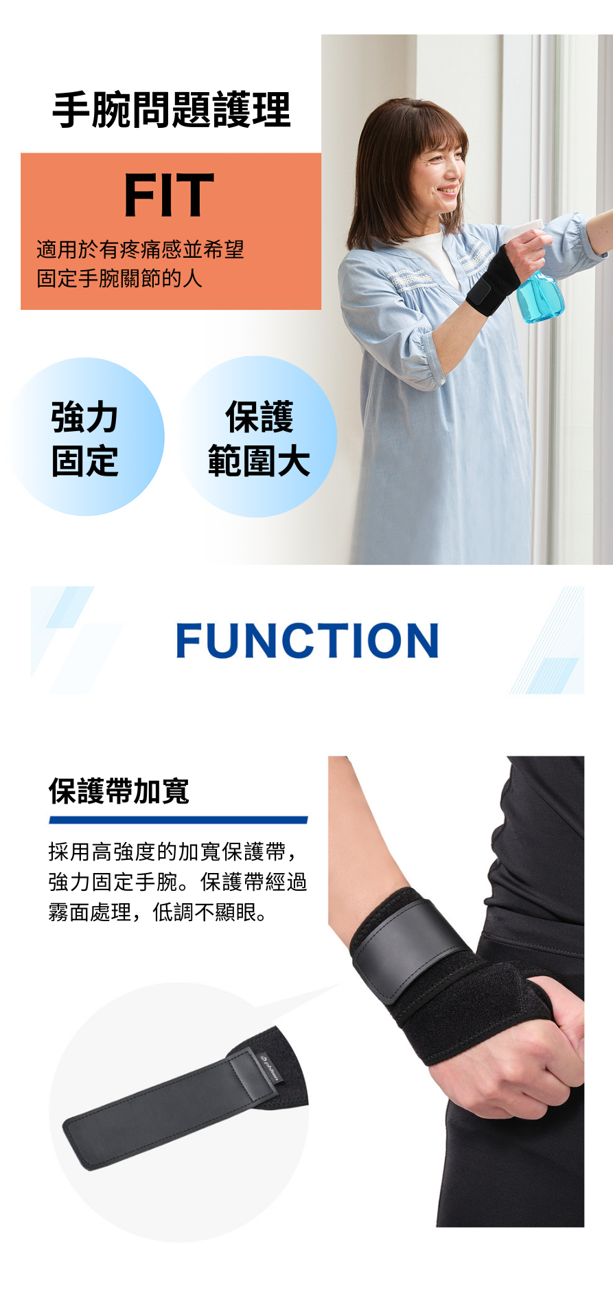· 日常手腕問題護理:穿戴簡單,強力固定保護手腕,適用於手腕有慢性疼痛或扭傷等突發性疼痛,亦用於腱鞘炎等關節問題;
